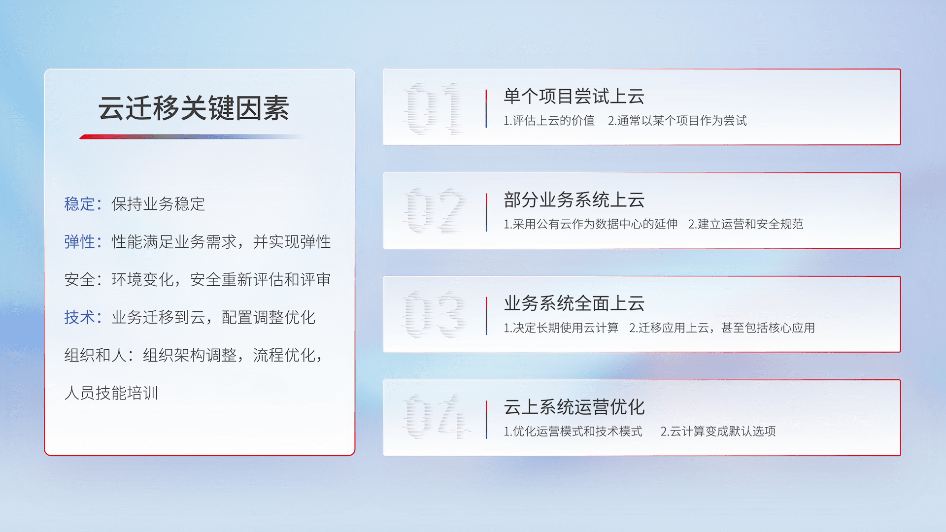 结合实际业务,,,,从规划设计、、、、云平台选型、、云原生改造、、数据迁移、、集成交付,,迁移全过程为客户识别最佳上云路径,,,,做好风险识别管理,,,,设计网络架构、、身份权限、、、、安全审计合规、、、、操作审计、、、、日志审计、、监控告警策略、、、、多站点容灾设计等,,,,对云上基础设施进行整体规划,,,提升IT治理水平,,,以满足弹性、、、、高可用、、、高性能的需求。。。