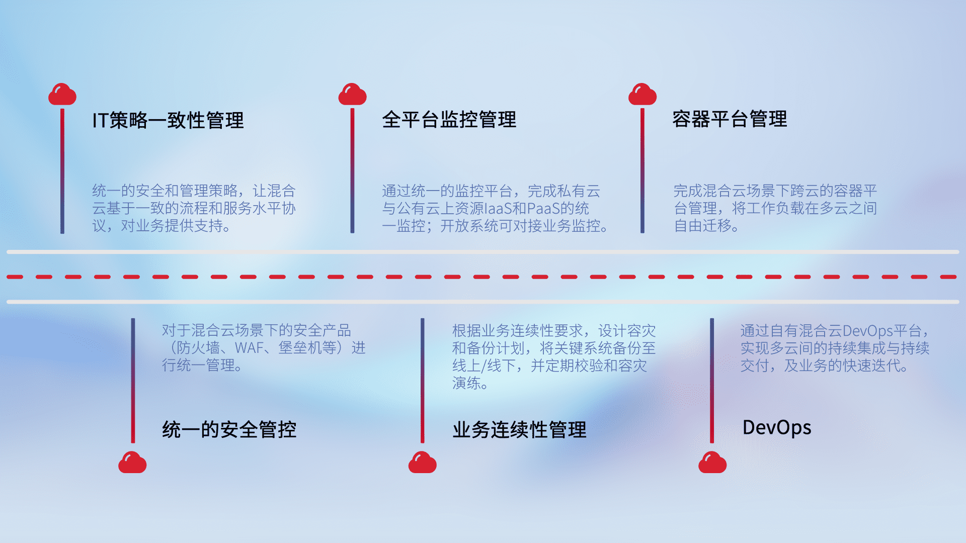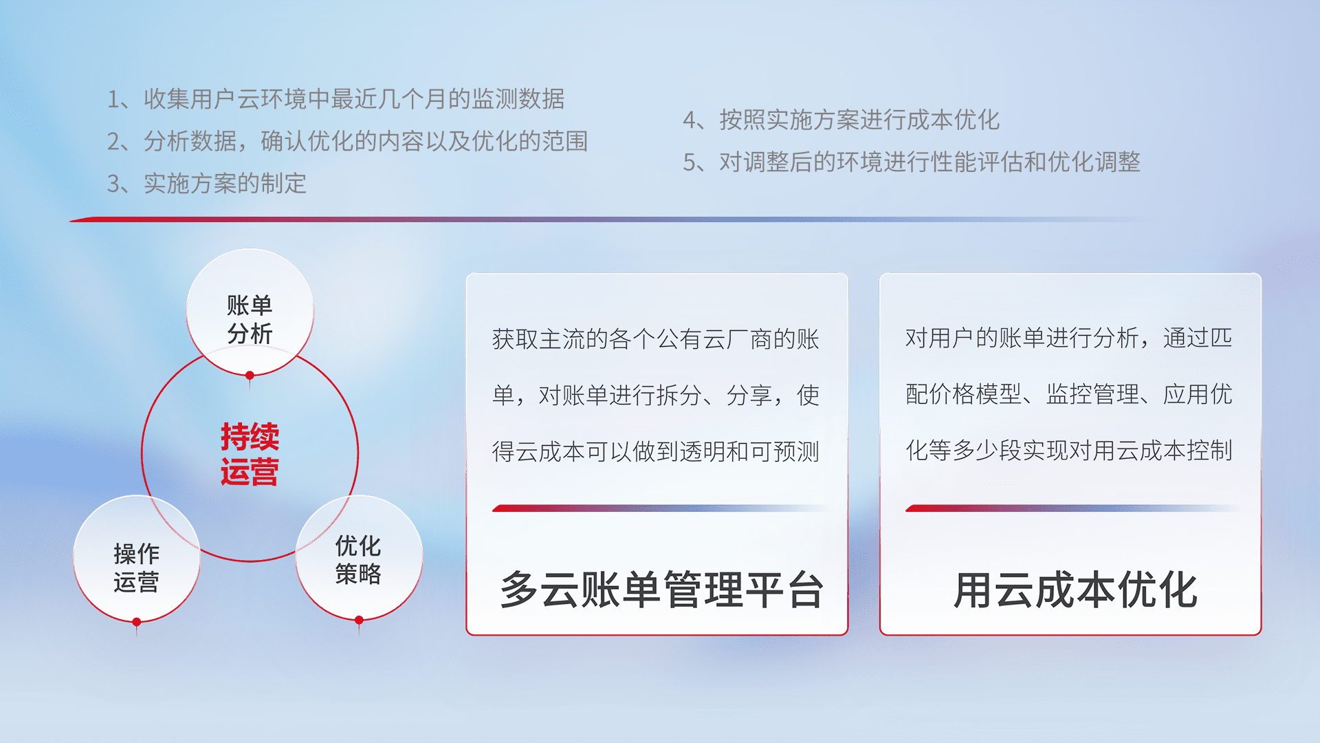 通过多云纳管,,以统一的资源数据模型把客户的云资源进行抽象和封装,,,,进而实现对多云资源的统一操作,,保障云资源管理的可靠性、、稳定性与可用性。。。。量身定制化运维内容,,,配置、、、开发运维、、补丁管理、、备份、、、、监控、、、、认证和访问管理、、、、审计和日常巡检等,,保障在用云过程中的可靠度,,稳定度以及高可用率。。。。