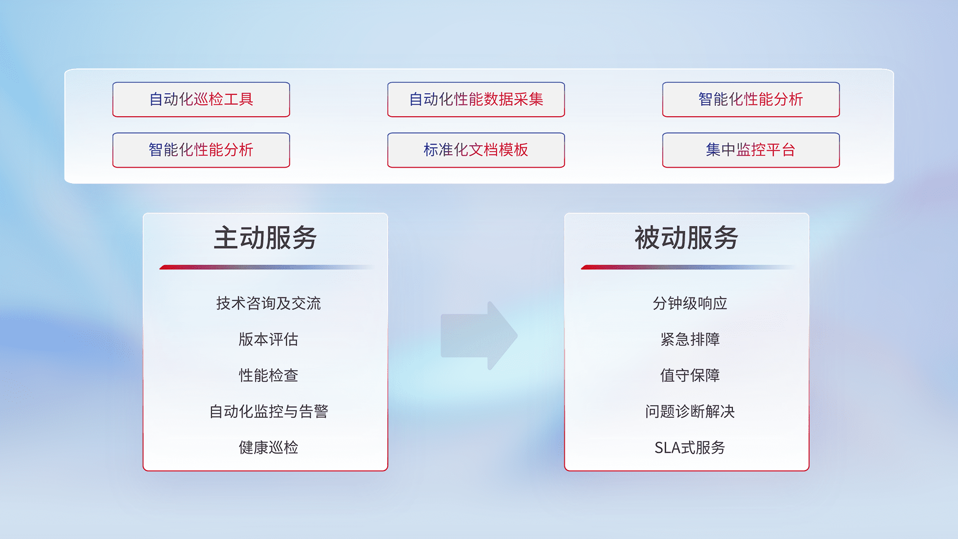 智能化工具和标准化文档,,,保障服务质量,,提供主动服务(包含技术咨询、、、、版本评估、、、、性能检查、、、、自动化监控与告警、、、、健康巡检)和被动服务包含(分钟级响应、、、、紧急排障、、值守保障、、、、问题诊断解决、、、、SLA服务)。。。。